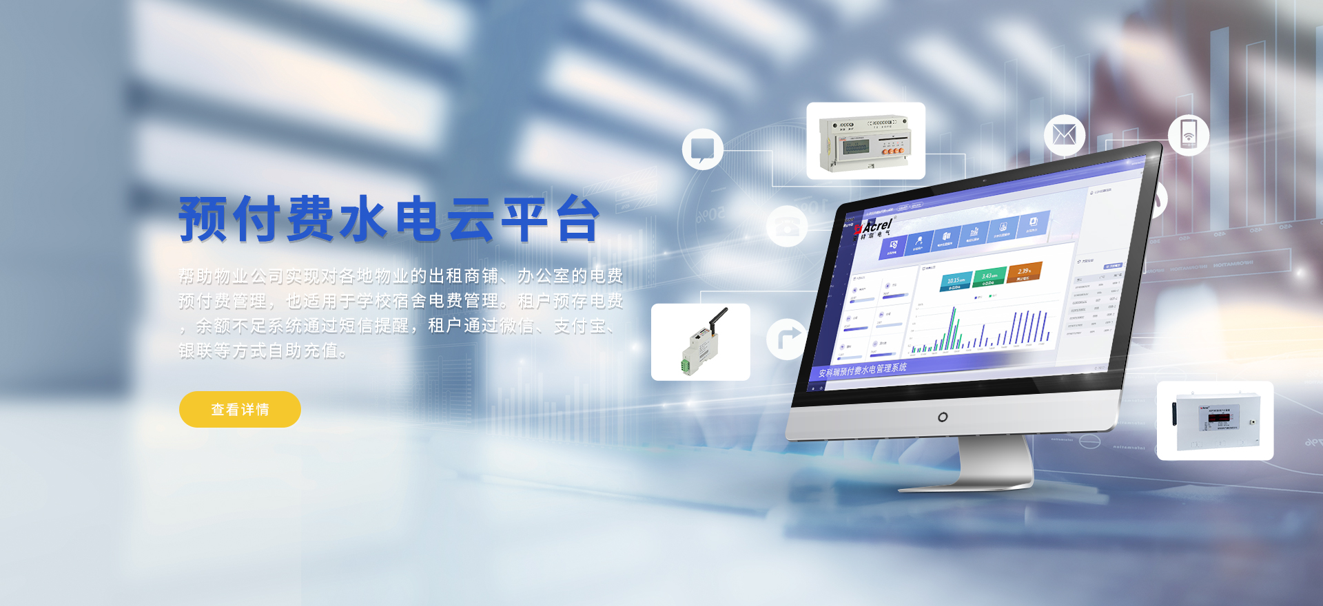 安科瑞提供的解決方案包括Acrel-EIoT能源物聯網云平臺變電所運維云平臺、安全用電管理云平臺環保用電監管云平臺、智慧消防云平臺能源管理云平臺、工業企業能源管控平臺、遠程預付費云平臺、餐飲油煙監管云平臺電動汽車/電瓶車充電樁收費管理云平臺、電力監控/無線測溫系統、電能質量治理系統、電氣火災監控系統消防設備電源監控系統、防火門監控系統、應急照明和疏散指示系統、智能照明控制系統、醫用隔離電源絕緣監測系統等,幫助用戶實現能源智能化、可視化、精細化管理,提高用能效率和用能安全,為企業節能降耗和實現能源數字化建設提供數據服務。
